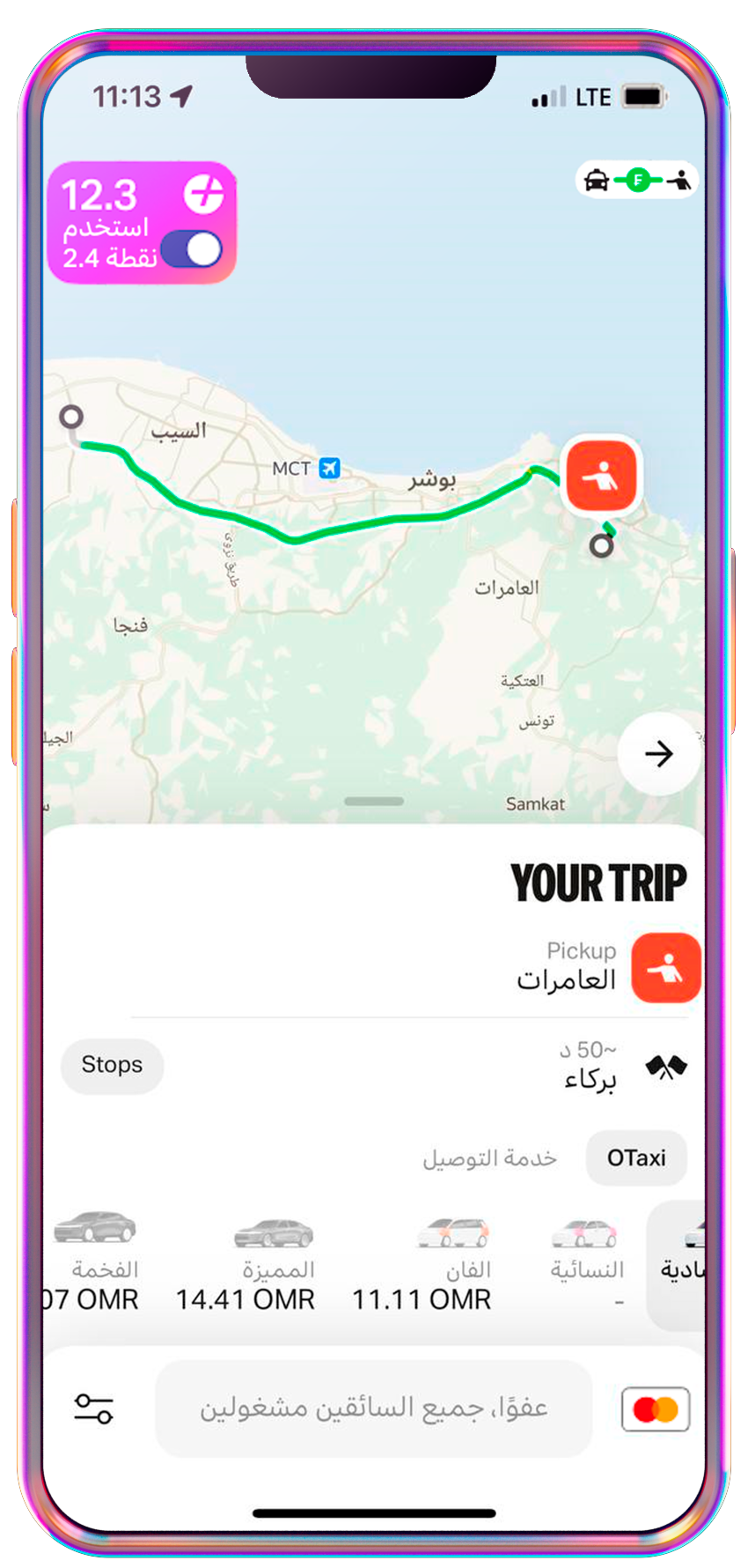 - إذا كنت تدفع بالبطاقة والنقاط، فإن إجمالي التكلفة يتم تثبيتها حتى انتهاء الرحلة، وإذا سارت الأمور على مايرام عندها سيتم الخصم من النقاط والمبلغ المتبقي من الدفع سيتم خصمه من خلال الدفع بالريال العماني.